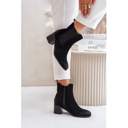 Dámské kotníkové boty z eko semiše. Vyznačují se podpatkem ve tvaru sloupku a zaoblenými špičkami. Zpevněná pata zajišťuje stabilitu a pohodlí při nošení. Na svršku elastická vložka. Vnitřek zateplený obuvnickou látkou. Tyto boty budou ideálním doplňkem podzimních outfitů!