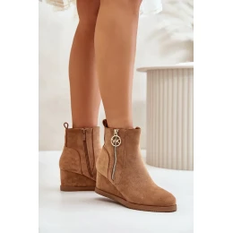 Zateplené Kotníkové Boty Na Klínku S Ozdobným Zipem Eko Semišové Camel Leretha