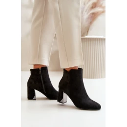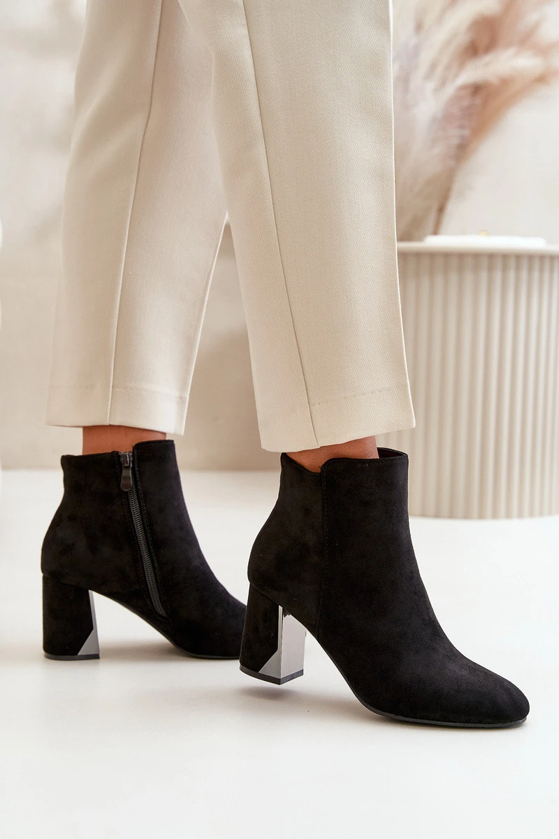 Elegantní boty z eko semiše, usazené na sloupkovém podpatku, se vyznačují špičatými špičkami, které jim dodávají šmrnc. Vnitřek je zateplený, což zajišťuje komfort v chladnějších dnech. Zapínají se na zip na boku, navíc ozdobené zlatým zipem, což dodává jedinečný styl. Při výběru velikosti se řiďte tabulkou velikostí.