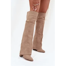 Zateplené kozačky s ohnutým horním dílem nad kolenem s jehlovým podpatkem béžové Serelle