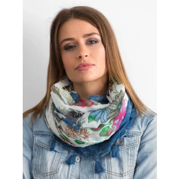 Modrá šála s květinovým potiskem.