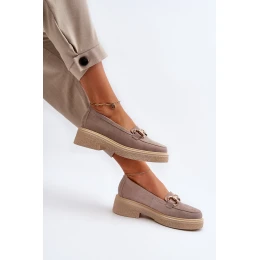 Tyto elegantní dámské mokasíny vyrobené z přírodního semiše nejsou pouze mimořádně stylové, ale také neuvěřitelně pohodlné. Jejich přední část je zdobená zlatým ozdobem, který jim dodává nádech luxusu a elegance. Umístěné na platformě a ploché podrážce. Profilovaná vložka zajistí pohodlí během nošení. Velmi módní střih, který můžete využít k mnoha stylizacím! Při výběru velikosti se řiďte tabulkou velikostí.