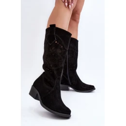 Dámské ažurové kozačky skvěle doplní jarní outfit. Vyrobené z přírodní semišové kůže. Nízký podpatek. Svršek po půlce lýtek je zapínán na zip. Špičaté nosky. Měkká stélka zajistí pohodlí během nošení. Při výběru velikosti se řiďte tabulkou velikostí.