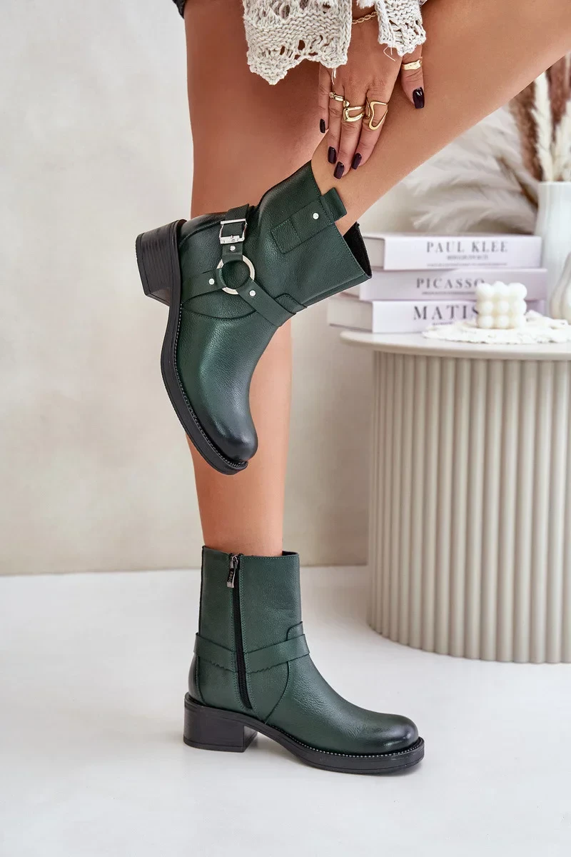 Zazoo Kožené Kotníkové Boty Na Nízkém Podpatku Zateplené Tmavě Zelené