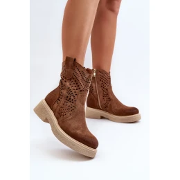 Zazoo Semišové dámské boty na plochých podpatcích, prolamované hnědé