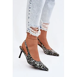 Dámské sandály na podpatku zdobené lesklými prvky imitujícími cihry jsou výjimečnou volbou pro ženy, které rády přitahují pozornost. Nápadné zdobení v květinovém motivu dodává ženský charakter. Model má špičaté nosy, které zdůrazňují eleganci a opticky zeštíhlují nohu. Štíhlý podpatek dodává postavě lehkost a zdůrazňuje její ženský tvar. Ideální volba na výjimečné příležitosti, večerní vycházky nebo oslavy – spojení lesku, elegance a módního vzhledu. Při výběru velikosti se řiďte tabulkou velikostí.