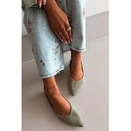 Dámské baleríny z eko semiše jsou stylovou a pohodlnou volbou na každý den. Plochá podrážka zajišťuje pohodlí při nošení, díky čemuž je model ideální na dlouhodobé používání. Špičaté nosy opticky zeštíhlují nohu a dodávají celkovému vzhledu elegantní charakter. Měkká vložka zvyšuje komfort, přizpůsobuje se noze a poskytuje pohodlí po celý den. Ideální volba pro ženy, které ocení spojení klasiky, pohodlí a jemné elegance. Při výběru velikosti se řiďte tabulkou velikostí.