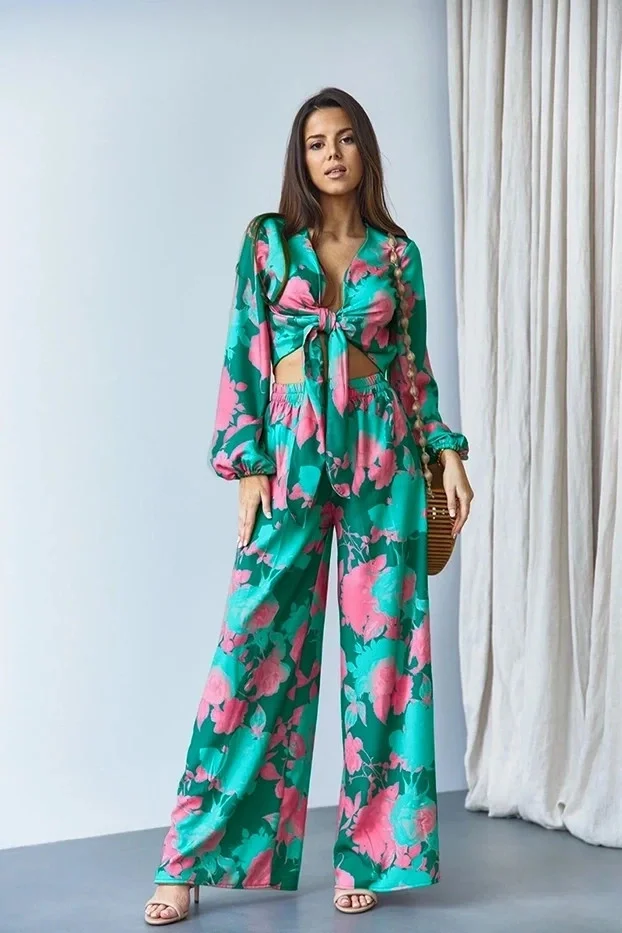 Zelená souprava - zavazovací halenka s široké kalhoty (8175)