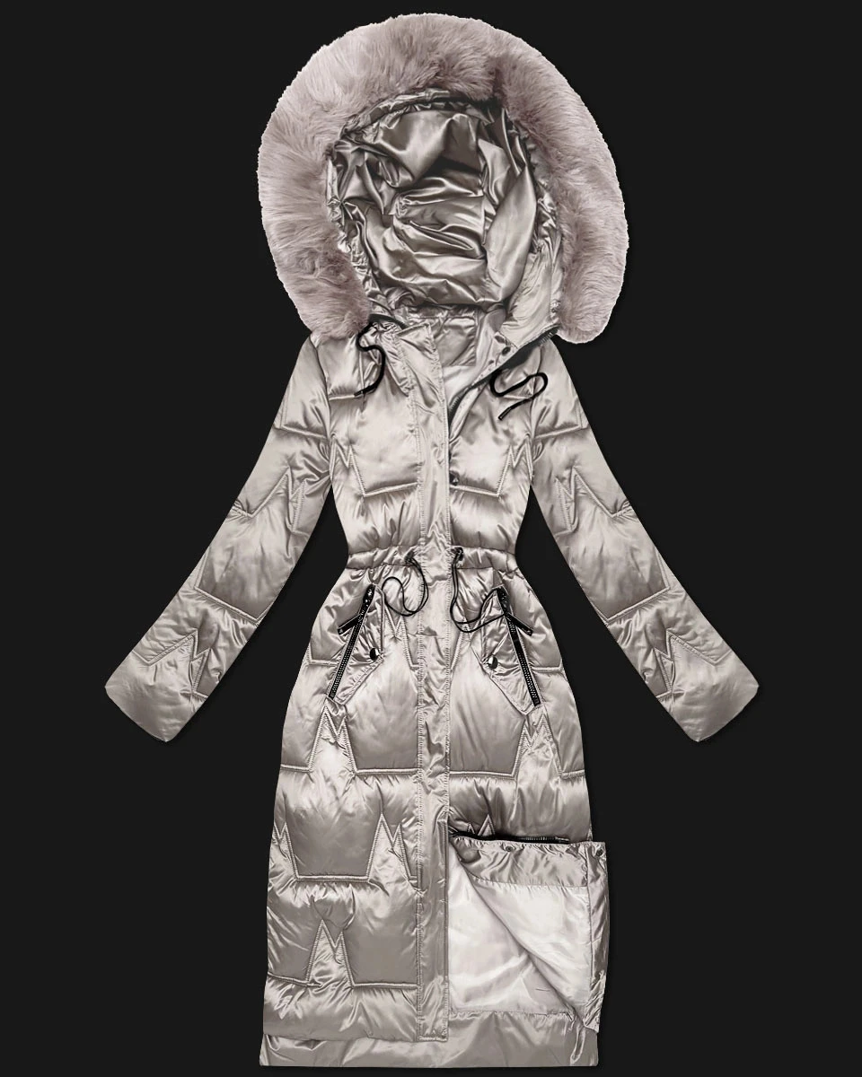 Bunda má lehce metalický lesk, je zateplená syntetickou péřovou výplní, má dvě kapsy a zapíná se dvousměrným zipem a panelem s patentkami. Model má kapuci olemovanou kožešinou. Zatímco kapuci není možné odepnout, kožešinu lemující kapuci odepnout lze. Na koncích rukávů jsou skryté stahovací lemy. Bunda má délku nad kolena.