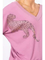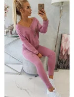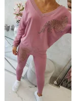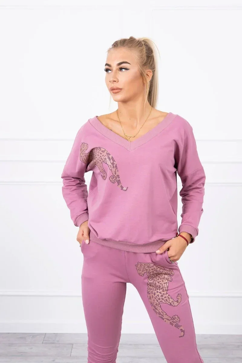 Prezentujemy Państwu komplet bluzy i spodni. Bluza oraz spodnie posiadają panterę z cyrkonii. Spodnie z kieszeniami i wiązaniem w pasie. Bluza z dekoltem V. Komplet wykonany jest z wysokiej jakości materiału. Rozmiar jest uniwersalny i będzie odpowiedni dla Pań w rozmiarze S, M lub L.
