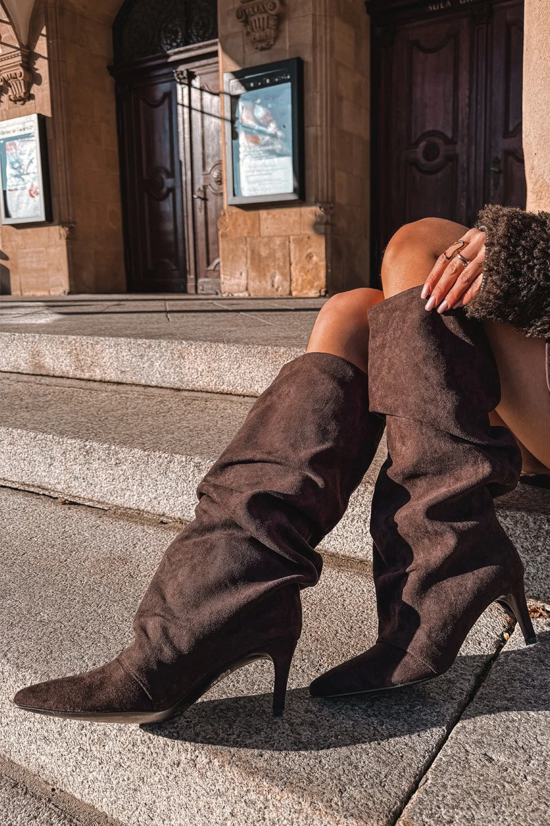 Zmačkané kozačky na jehlovém podpatku z eko semiše vyhřívané čokoládové Mavella