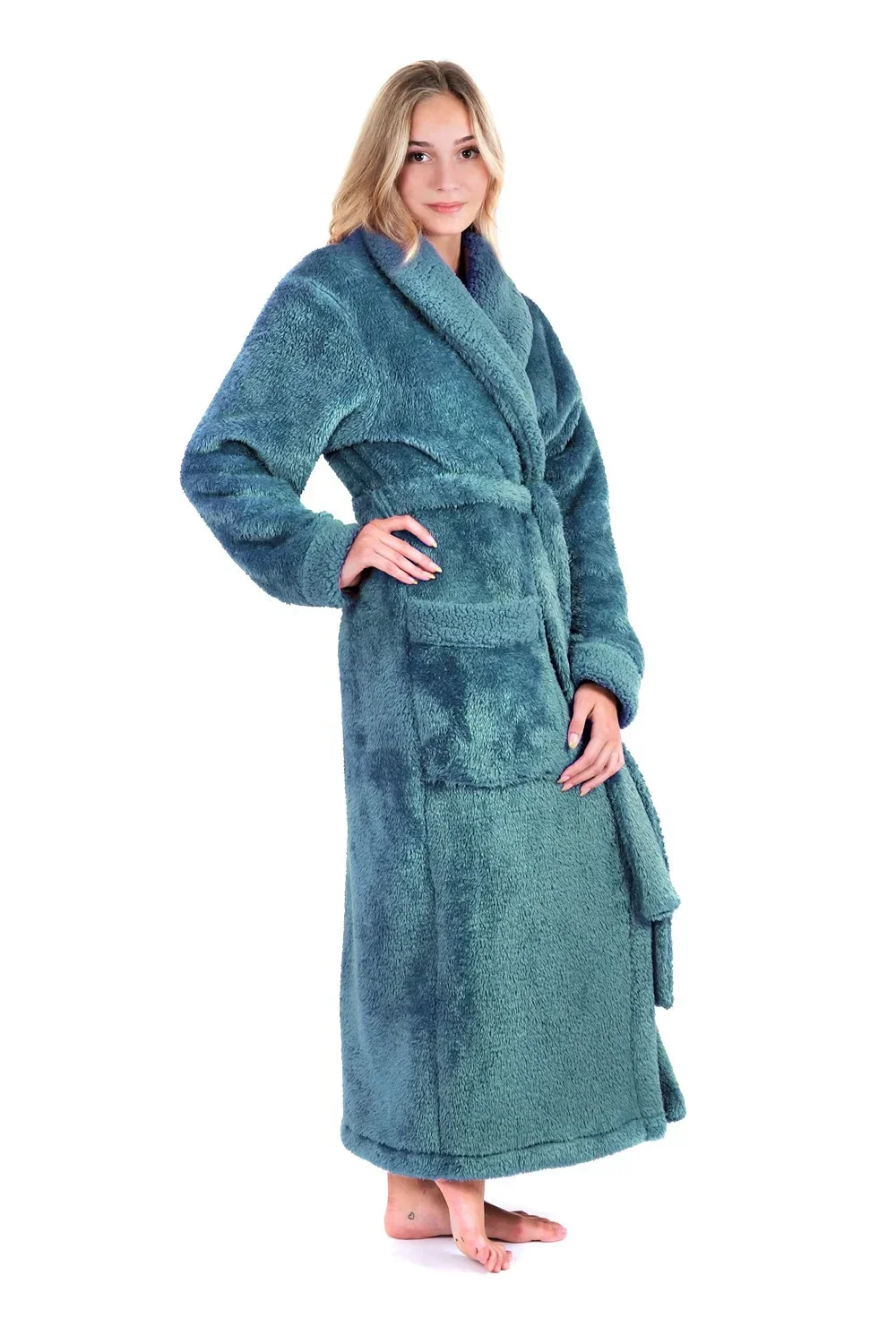 Použitý materiál má dlouhý hustý vlas, lícová strana je jemně lesklá, rubová strana pak připomíná ovčí kožešinu a spolu tvoří elegantní kombinaci, která vynikne na lemech kapes a rukávů a na velkém šálovém límci. Dvě prostorné nakládané kapsy pojmou všechny důležité drobnosti, bez nichž se neobejdete. Převázáním pak uzpůsobíte obvod županu vašim potřebám. Materiál je mírně pružný a díky své měkké a husté struktuře poskytuje skvělé izolační vlastnosti. Udržuje teplo a zároveň je prodyšný.