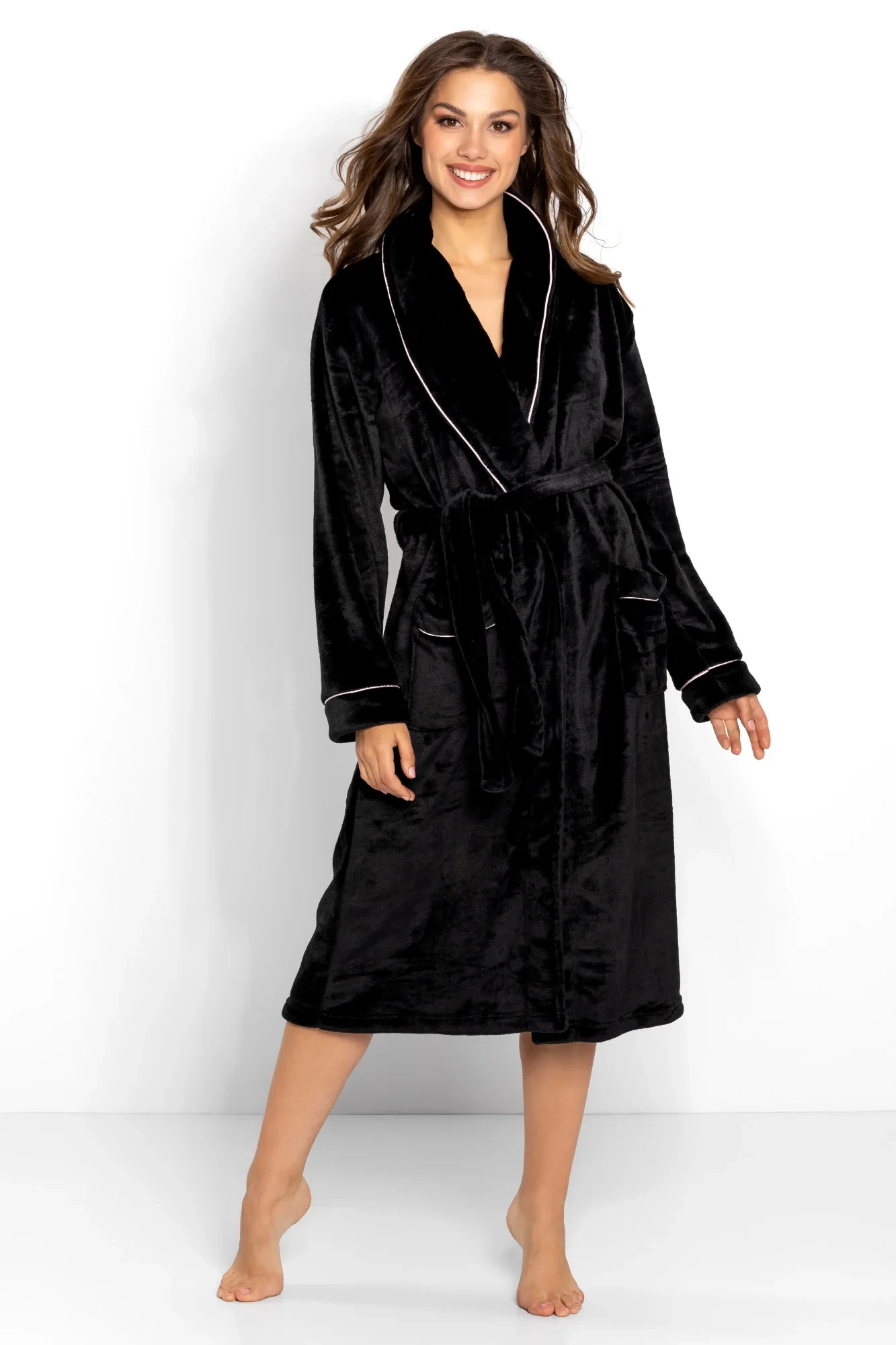 Elegantní dámský župan s dlouhými rukávy, kapsami a páskem na zavazování. Župan je vyroben z látky příjemné na dotek.