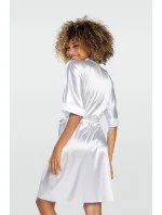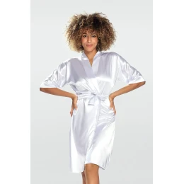 Župan s krátkými rukávy z elastického saténu. Župan má volný, pohodlný střih se zavazováním v pase.