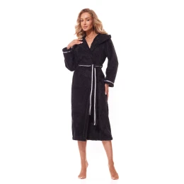 Tento župan je kombinací pohodlí a elegance. Díky volnému a pohodlnému střihu se pohodlně nosí a kapuce mu dodává módní nádech. Župan je vybaven praktickými kapsami pro uložení drobností. Lemování (lemování) dodává eleganci a třídu. Je vyroben z lesklé pleteniny, která mu dodává zvláštní kouzlo. Rukávy jsou dlouhé, takže je ideální pro chladnější večery. Vysoce kvalitní polský výrobek zabalený v elegantním pouzdře. Je ideální volbou jak pro domácí relaxaci, tak jako domácí oděv, kterým se můžete pochlubit.