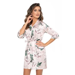 Půvabný a elegantní saténový župan NELLY. Je celý vyroben z jemného hedvábného saténu. Materiál je zdobený květy v pudrově růžové, bílé a zelené barvě. V pase přepásaný páskem. Celek tvoří krásně třpytivou a elegantní kompozici. Vyrobeno v Polsku.