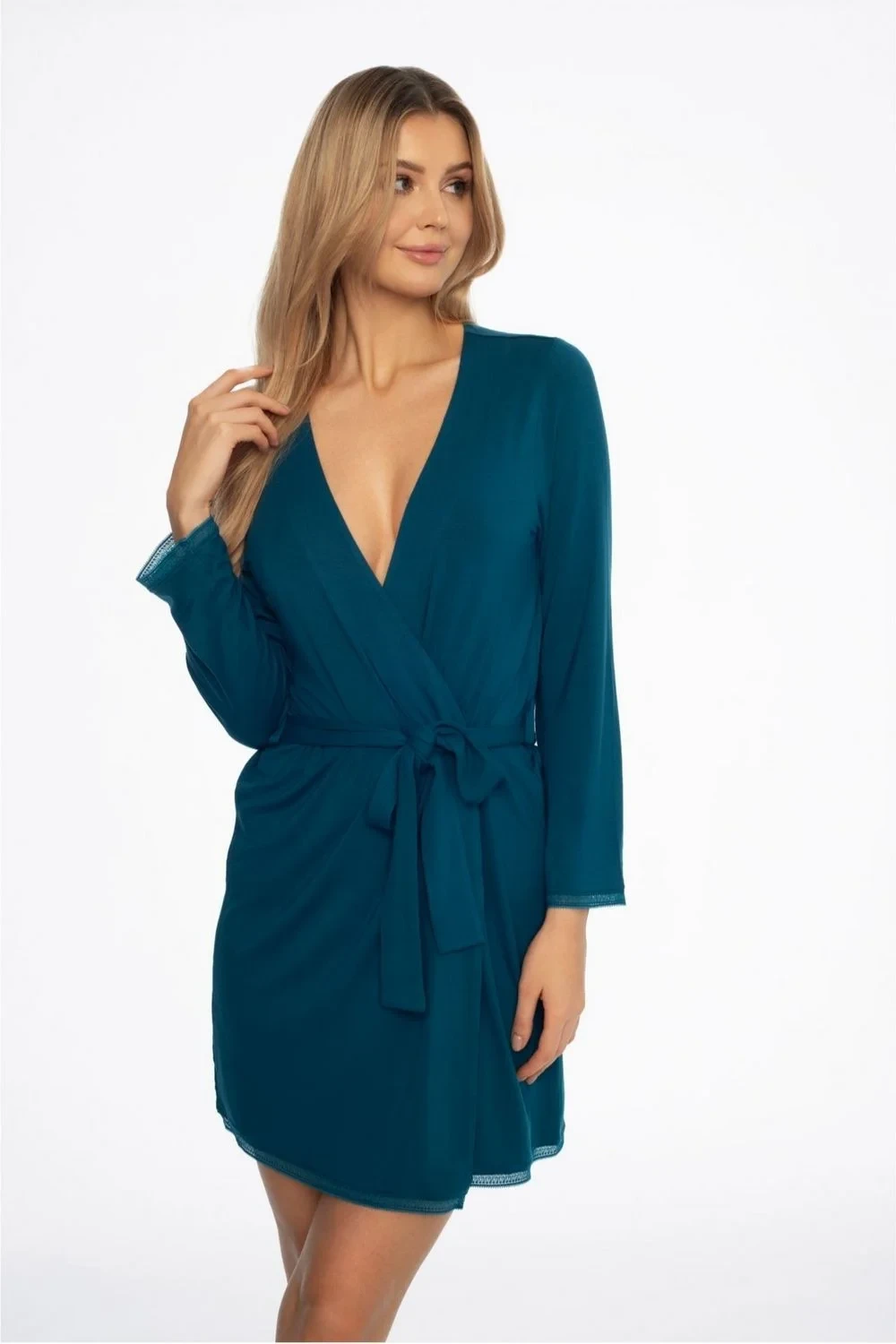 Župan Alena je vhodný pro ženy, které hledají lehký oděv na letní večery. Byl ušit z úpletu příjemného na dotek v tmavě mořském odstínu. Dámský župan v délce do poloviny stehen se v pase zavazuje na dlouhý pásek, takže si ho můžete snadno přizpůsobit své postavě.