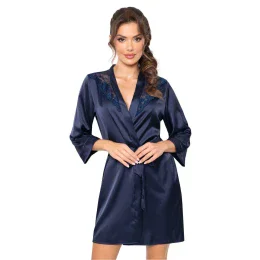 Ženský župan vyrobený z hedvábné satény. Výstřih zdobený krajkou, široký rukáv, pásek k zapínání.