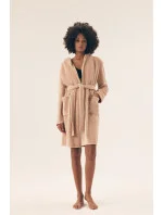 Měkký a příjemný župan pro ženy v uvolněném a pohodlném střihu, ideální pro každodenní použití a jako domácí oblečení. Vyrobený z látky s raženým vzorem, který dodává celku elegantní a ženský vzhled. Model má kapuci, praktické kapsy a pásek na stažení, který umožňuje přizpůsobit župan postavě. Délka po kolena zajišťuje pohodlí a volnost pohybu. Župan je balený v plastovém sáčku, skvělý také jako dárek.