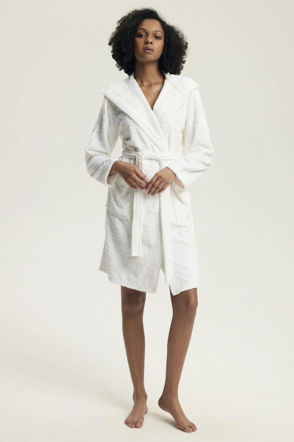 Měkký a příjemný župan pro ženy v uvolněném a pohodlném střihu, ideální pro každodenní použití a jako domácí oblečení. Vyrobený z látky s raženým vzorem, který dodává celku elegantní a ženský vzhled. Model má kapuci, praktické kapsy a pásek na stažení, který umožňuje přizpůsobit župan postavě. Délka po kolena zajišťuje pohodlí a volnost pohybu. Župan je balený v plastovém sáčku, skvělý také jako dárek.