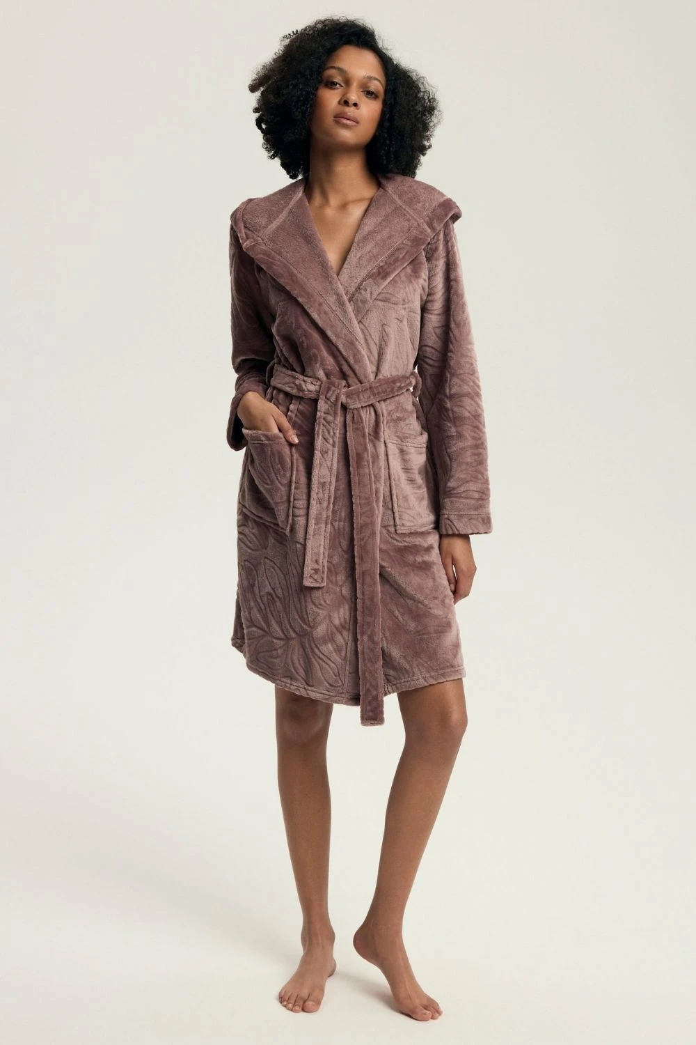 Měkký a pohodlný župan pro ženy s volným a pohodlným střihem, ideální pro každodenní použití a jako domácí oděv. Vyrobený z látky s raženým vzorem, který dodává celku elegantní a ženský vzhled. Model má kapuci, praktické kapsy a pásek, který umožňuje přizpůsobit župan postavě. Délka po kolena zajišťuje pohodlí a volnost pohybu. Župan je dodáván v plastovém sáčku, skvělý také jako dárek.