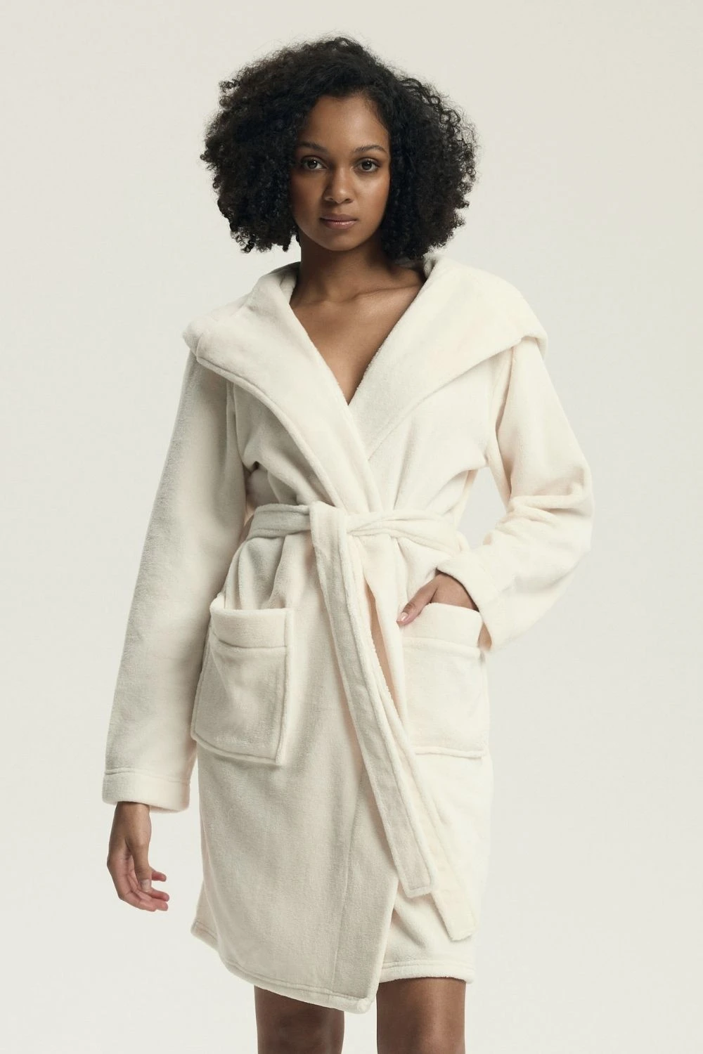 Měkký a příjemný župan pro ženy s volným a pohodlným střihem, který zajišťuje plnou volnost pohybu a pohodlí při nošení. Vyrobený z teplého, příjemného na dotek materiálu, skvěle drží teplo, ideální na chladnější dny a večery. Model má kapuci, praktické kapsy a pásek, který umožňuje přizpůsobení postavy. Délka po kolena z něj činí lehký a pohodlný k nosení. Župan je dodáván v fóliovém sáčku, skvělý také jako dárek.