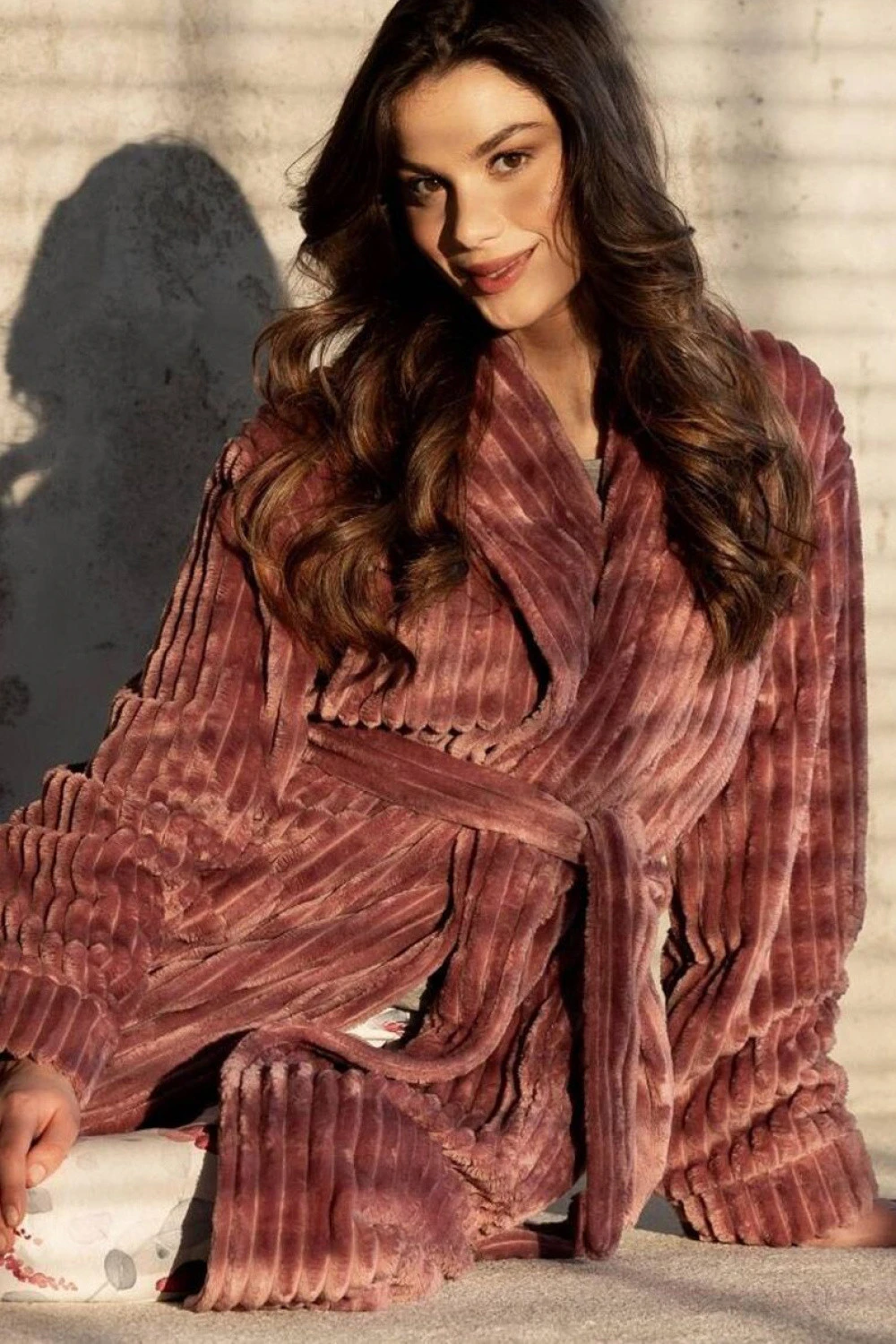 Elegantní ženský župan, který spojuje styl a pohodlí v jednom. Navržen s ohledem na každodenní použití, skvěle poslouží jak jako praktický domácí oděv, tak elegantní dárek díky moderní barevnosti a vysoké kvalitě zpracování. Model s dlouhými rukávy ukončenými manžetami představuje klasický styl a praktické kapsy mu dodávají funkcionalitu. Šňůrkování v pase umožňuje perfektní přizpůsobení postavě a zajišťuje pohodlné nošení. Materiál s nízkou smrští zaručuje trvanlivost a estetický vzhled po dlouhou dobu. Župan je balen v elegantní taštičce, což z něj činí skvělý nápad na dárek. Navržen a ušit v Polsku s důrazem na každý detail, představuje ideální volbu pro ženy, které oceňují moderní vzhled a pohodlí v každodenním životě.