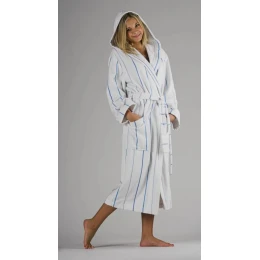 Proužkovaný župan s kapucí, délka pod kolena, velké kapsy, zavazování na pásek. Materiál: 100%Bavlna, velur 420g/m2