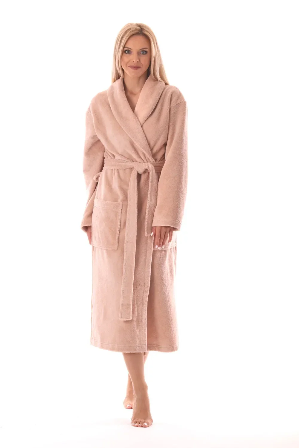 Měkký, savý materiál příjemně hřeje a zároveň dýchá. Šálový límec přidává dotek elegance, která nepůsobí okázale, ale přirozeně. Střih je pohodlný, volný, abyste se v něm cítila komfortně nejen doma ale i u bazénu, ve wellness nebo v odpočívárně vaší oblíbené sauny.
