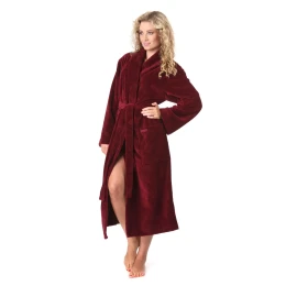 Měkký, savý materiál příjemně hřeje a zároveň dýchá. Šálový límec přidává dotek elegance, která nepůsobí okázale, ale přirozeně. Střih je pohodlný, volný, abyste se v něm cítila komfortně nejen doma ale i u bazénu, ve wellness nebo v odpočívárně vaší oblíbené sauny.