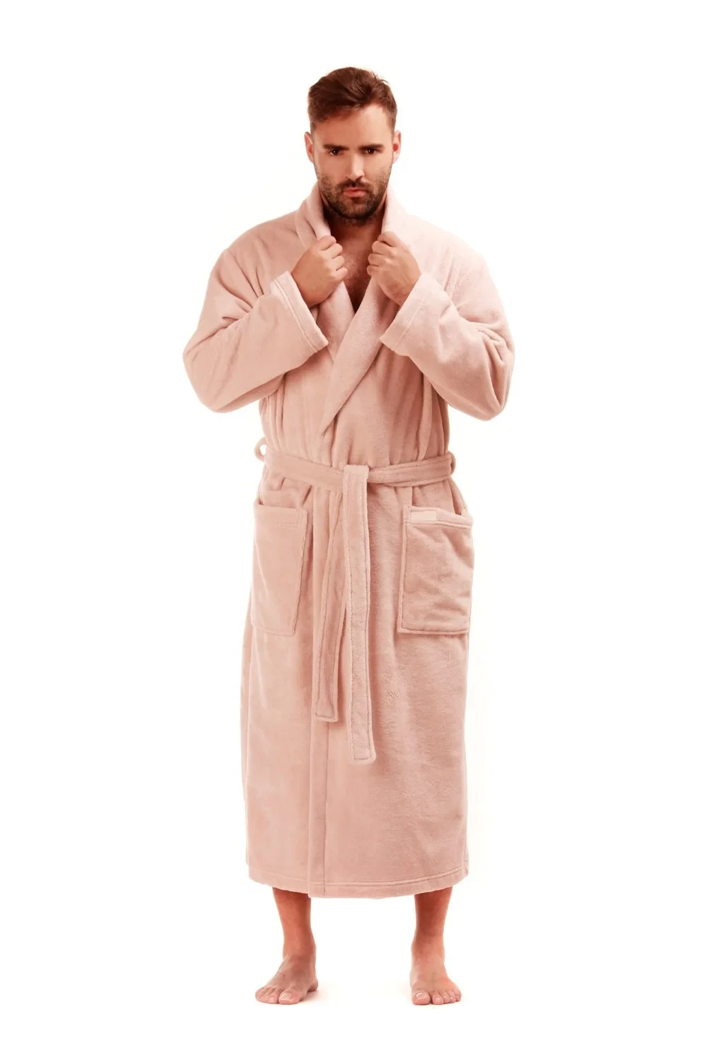 - pohodlný unisex střih se šálovým límcem, dvěma kapsami a páskem na převázání.