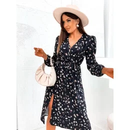 Šaty mají přeložený obálkový výstřih, dlouhé rukávy olemované gumičkou a v pase mají gumu. Ve spodní části modelu je rozparek. Šaty mají délku pod kolena.